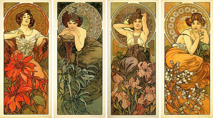 L'influence de l'Art Nouveau né en Belgique et dans le nord de la France se fera sentir très vite sur le reste de l'Europe. Après Bruxelles, Nancy et Paris, Vienne, Barcelone, Glasgow puis Chicago verront s'épanouir des œuvres liées à cette nouvelle conception de l'art. Citons quelques artistes incontournables : Victor Horta, Hector Guimard, Antonio Gaudi, Otto Wagner, Josef Hoffman, Gustav Klimt, Henri Van de Velde, Paul Daum, Emile Gallé, René Lalique, Louis Majorelle, Charles Rennie Mackintosh, Louis Comfort Tiffany, Jules Chéret et Alfons Mucha. Les progrès de la lithographie aidant, les arts graphiques n'échappèrent pas à ce mouvement, la reliure, le papier peint et même la bande dessinée avec Little Nemo de l'américain Winsor Mc Cay y ont participé. L'illustration devint omniprésente dans la vie quotidienne ; les journaux, les livres, les calendriers, les almanachs, les cartes postales, les menus, les affiches diffusèrent des images qui désormais se collectionnèrent. Les hommes-sandwiches, les colonnes Morris, les panneaux d'affichage, les palissades, les kiosques à journaux multiplièrent à loisir cette frénésie d'images qui envahit la rue. Les étiquettes connurent la même excitation créative. Le dessin de certaines de nos étiquettes est directement influencé par des affichistes comme Jules Chéret ou Alfons Mucha, mais si l'un glorifia la Belle Epoque, l'autre se mit au service de l'Art Nouveau. L'époque et le style se confondent dans les quelques étiquettes réunies ici mais toutes possèdent de façon plus ou moins affirmée des spécificités de l'Art Nouveau et l'esprit de la Belle Epoque : présence d'ornements végétaux caractéristiques, dessins parfois cernés comme avait coutume de le faire Alfons Mucha (technique particulière du vitrail et de la céramique, procédé qu'il avait adopté), utilisation de typographies redessinées sans respecter les règles habituelles et ne se soumettant qu'à la fantaisie de leurs créateurs.