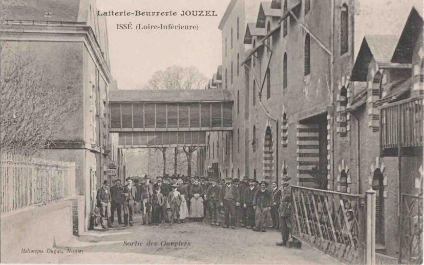 Dans la deuxième moitié du XIXe siècle, la famille nantaise Perraud achète le moulin et modernise le site (conversion en minoterie et adjonction de bâtiments reliés par deux passerelles). Cette famille possède une autre minoterie sur la commune au Lieu-dit Beaumont. L'ensemble est vendu en 1897 à Auguste Richer qui le cède dès 1900 à Camille Jouzel, fondateur de la laiterie. Le 19 mars 1900 sont expédiés de la gare d'Issé les premiers kilos de beurre. Entre 1900 et 1904, Camille Jouzel transforme l'outil de production pour en faire une « usine modèle » permettant une production massive de beurre : organisation interne optimisée par des ateliers clairs et aérés, achat d'outillage moderne, maîtrise de toutes les étapes de fabrication, de la collecte à l'emballage. Des centaines de kilos de beurre sont exportés vers Paris, les départements du Nord et l'Angleterre. 150 personnes travaillent à cette époque dans l'usine. En 1906, la laiterie beurrerie intègre la Société Anonyme de la Nantes butter and Refrigerating Company Limited dont le siège social est à Londres. Le 9 avril 1910, un violent incendie détruit presque entièrement l'usine qui est reconstruite en 1911. En 1913, la laiterie est cédée et transformée en tannerie. Nous y reviendront sur l'histoire de cette beurrerie.